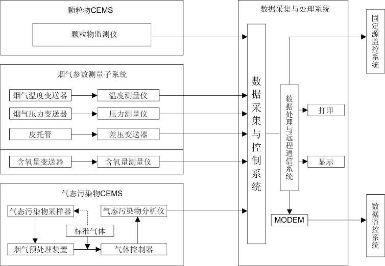 我公司固定污染源煙氣排放連續(xù)監(jiān)測(cè)系統(tǒng)由采樣探頭、粉塵儀、溫壓流一體監(jiān)測(cè)儀、分析機(jī)柜、標(biāo)準(zhǔn)樣氣、管線等組成。其中采樣探頭、粉塵儀、溫壓流探頭安裝于監(jiān)測(cè)點(diǎn)(煙道或煙囪),分析機(jī)柜安放于室內(nèi)。樣氣通過(guò)采樣探頭、伴熱管線進(jìn)入分析機(jī)柜,經(jīng)由分析機(jī)柜內(nèi)的預(yù)處理系統(tǒng)進(jìn)入煙氣分析儀,測(cè)量SO2、NOX、氧含量等參數(shù);粉塵儀用于測(cè)量粉塵濃度,溫壓流一體監(jiān)測(cè)儀用于測(cè)量溫度、壓力、流速,測(cè)量信號(hào)通過(guò)電纜傳輸至分析機(jī)柜內(nèi)的數(shù)據(jù)采集與處理系統(tǒng);置于分析機(jī)柜內(nèi)部的工控系統(tǒng)可實(shí)現(xiàn)實(shí)時(shí)數(shù)據(jù)的顯示、數(shù)據(jù)傳輸、數(shù)據(jù)儲(chǔ)存、歷史數(shù)據(jù)查詢、圖形數(shù)據(jù)分析、報(bào)表統(tǒng)計(jì)等功能。標(biāo)準(zhǔn)氣體用于校準(zhǔn)分析儀表。